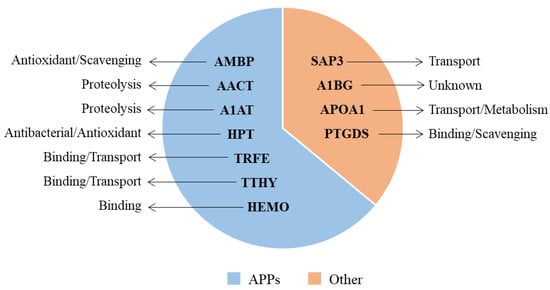 In addition, were pointed out the main functions of each protein (Figure 3). As evidenced, most of the detected proteins (64%) were acute-phase proteins (APPs). However, these proteins play other roles, including antioxidant, radical scavenging, and tissue repair (AMBP), proteolysis (AACT, A1AT), antioxidant and antibacterial activity (HPT), iron binding and transport (TRFE), hormone binding and transport (TTHY), heme and metal ion binding (HEMO). Other proteins (36%) were involved in further biological actions, namely lipid transport (SAP3), steroid metabolism and cholesterol transport (APOA1), binding of lipophilic molecules and scavenging of harmful hydrophobic constituents (PTGDS), as inferred by the UniProtKB and The Human Protein Atlas databases (accessed on 30 May 2022).