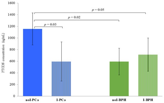 The urinary concentration of PTGDS was significantly higher in noI-PCa (1156.8 ± 276.2 ng/mL) compared to: I-PCa (595.6 ± 338.3 ng/mL) (p = 0.03), noI-BPH (712.6 ± 285.8 ng/mL), (p = 0.02) and I-BPH (593.2 ± 229.3 ng/mL) (p = 0.05) (Figure 4). Conversely, no significant differences were found between I-PCa and I-BPH, and I-BPH vs. noI-BPH (p > 0.05).