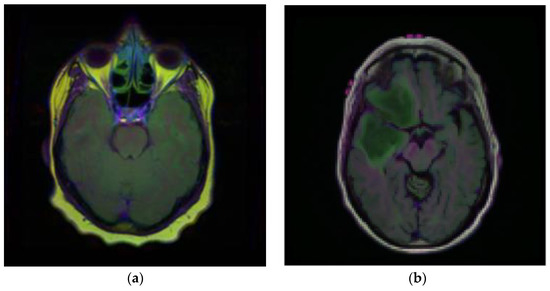 Brain MRI scans from 110 patients with 3929 brain MRI images are included in the dataset using FLAIR abnormalities. Out of the total 3929 dataset images, 90% of the data are used for training and 10% are used for testing. After that, out of the 90% training data, 15% are used for the validation set. Figure 2 illustrates the brain MRI images taken from Kaggle [28,29]. Figure 2a displays the normal image and Figure 2b displays the tumor image of the brain in which two tumor regions are shown with a break in between. It is difficult to segment this break region in the tumor part. The proposed methodology shown in Figure 3 is also segmenting this break part accurately.