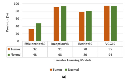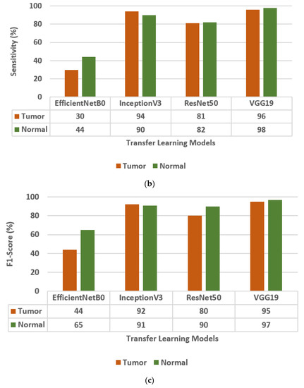 The different Transfer Learning (TL) models that are used for the classification of brain tumors are EfficientNetB0, InceptionV3, ResNet50 [30], and VGG19. The values of the confusion matrix parameters, such as Precision (PR), Sensitivity (SN), and F1-score (FS) are obtained on all four transfer learning models and are shown in Figure 3. From the analysis of PR, SN, and FS as presented in Figure 3a–c, respectively, it is concluded that the VGG19 model outperforms the other three TL models, i.e., EfficientNetB0, InceptionV3, and ResNet50. The VGG19 model has obtained a precision of 95%, sensitivity of 96%, and F1-score of 95% for brain tumor classes.