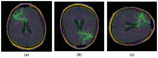 To obtain more, and more varied images of brain tumors, the data augmentation technique is used with the existing images. The different data augmentation techniques [31,32,33] that are applied are vertical flipping and horizontal flipping. Figure 6a displays the original sample of the brain tumor image, Figure 6b displays the vertically flipped image, and Figure 6c displays the horizontally flipped image.