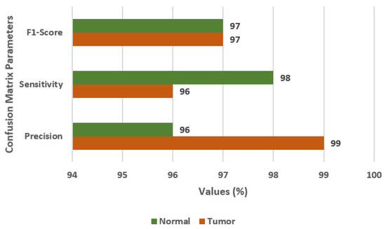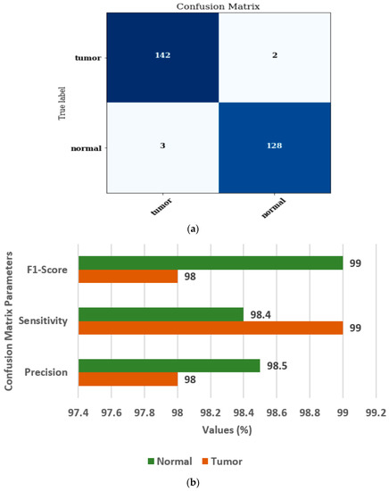 Figure 10 shows the confusion matrix and confusion matrix parameters of the ensemble model [37,38]. Figure 10a displays the confusion matrix for normal and brain tumor classes. Figure 10b displays the values of FS, SN, and PR as 98%, 99%, and 98%, respectively, for the tumor class.