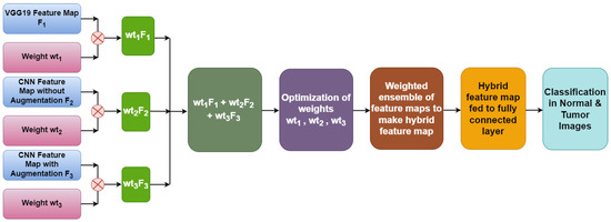 Figure 8 illustrates the weighted ensemble of three feature maps extracted from three different models. These weights are further optimized by using a grid search combination to achieve the maximum accuracy value of the ensemble model. Equation (1) shows the formula of the hybrid feature map for the best combination of weights.