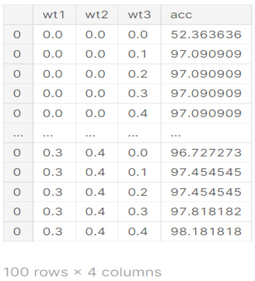 From Figure 9, it can be seen that for the different values of wt1, wt2, and wt3, different values of accuracies are obtained. The best value of accuracy 98.18% is obtained on weights 0.3, 0.4, and 0.4 as shown in Figure 9.