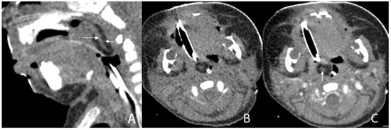 CT of a 1-month and 16-day girl presenting with throat congestion 29 days after birth. (A,B) Sagittal and axial CT, displayed in the soft-tissue window, shows a sausage-like fat density mass (short arrow) with a soft tissue density core (long arrow) originating from the left lateral pharyngeal wall. (C) Axial, postcontrast CT, displayed in the soft-tissue window, shows that the lesion’s stalk is slightly enhanced (arrow), but the rest of the lesion is not enhanced.