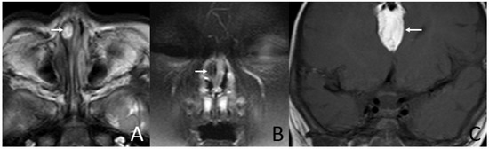 MRI of a 6-month-old and 18-day-old girl presenting shortly after birth with nasal obstruction. (A) Axial T2-weighted MRI shows a sausage-like mass (arrow) in the right nasal vestibule and nasal limen that is mainly high-signal with linear low-signal inside. (B) Coronal T2W-SPIR MRI shows the hyperintensity component of the mass suppressed (arrow). (C) Coronal T1-weighted MRI shows an irregular mass (arrow) containing fat in the intracranial midline that mainly has a high-signal with irregular linear low-signal inside.