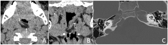 - Gulati, M.; Gupta, S.; Prakash, A.; Garg, A.; Dixit, R. HRCT imaging of acquired cholesteatoma: A pictorial review. Insights Imaging 2019, 10, 92. [Google Scholar] [CrossRef] [PubMed]