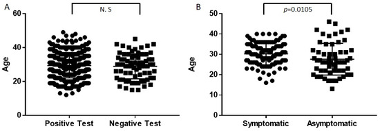 Age comparison. (A) Comparison of age between individuals with a positive test for SARS-CoV-2 versus individuals with a negative test revealed no significant differences. (B) Mothers with a positive SARS-CoV-2 test were divided into symptomatic and asymptomatic; age comparison between them revealed that symptomatic women were older than asymptomatic (p = 0.0105). Mean comparison was performed using the Student’s t-test.