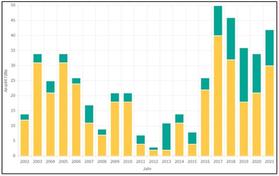 Echinococcus cases in Austria from 2002 through 2021 (yellow–E. granulosus, green–E. multilocularis). Original report of the Austrian Public Health Office in Tyrol, Innsbruck (Tiroler Gesundheitsamt): “Anzahl Fälle”: Number of Cases (Y-axis) and “Jahr”: Year (X-axis). This data have been collected directly from the Austrian Public Health Office from the first author (JH).