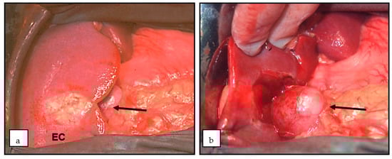 (a,b). Hydatid cyst in segment 5 of the Liver (EC) (Arrow). Operation site before (a) and after preservation of the gallbladder (b) (Arrow) EC: E. cysticus.