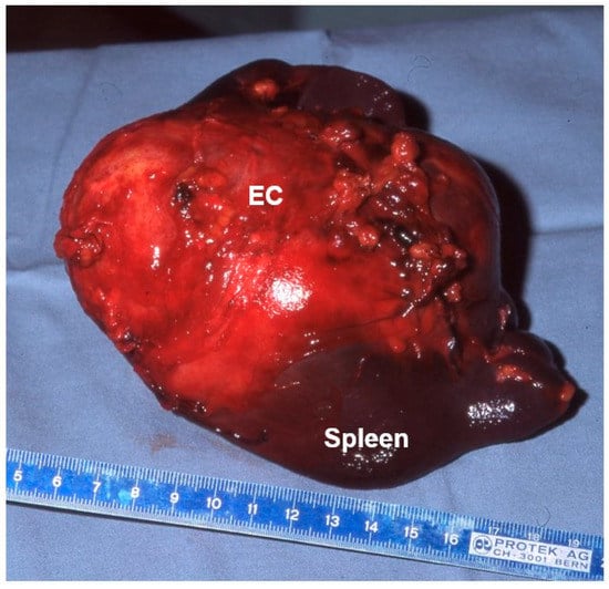 Spleen with massive involvement of E. granularis (EC) in a six-year-old girl. The remaining splenic tissue is marked (spleen).