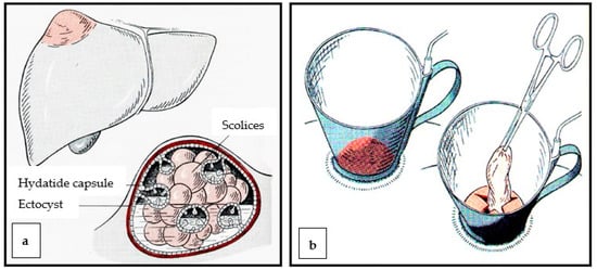 - Nunnari, G.; Pinzone, M.R.; Gruttadauria, S.; Celesia, B.M.; Madeddu, G.; Malaguarnera, G.; Pavone, P.; Cappellani, A.; Cacopardo, B. Hepatic echinococcosis: Clinical and therapeutic aspects. World J. Gastroenterol. 2012, 18, 1448–1458. [Google Scholar] [CrossRef]
