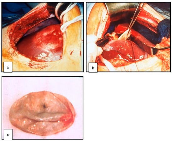 Another possible procedure is the laparoscopic or surgical-open emptying or removal of the so-called endocyst, whereby the edges of the pericyst are usually marsupialized. Finally, the cyst cavity can be drained or closed with an omental flap (omentoplasty) [48]. Surgical resection is the first-line therapy for large (diameter larger than 10 cm) cysts with multiple daughter cysts, cysts that communicate with the biliary system, and any cyst that puts pressure on vital organs [17]. In the case of superficial liver cysts with a risk of rupture (traumatic or spontaneous) and superinfected cysts, percutaneous treatment is usually not possible; surgical removal is also indicated in these cases. The section of the liver containing the hydatid cyst can be removed minimally invasively, mainly if it affects segments VI, VII, and VIII [49,50,51], or conventionally. The procedure is identical for both cases: either in the sense of the PAIR technique (formerly known as the frozen cone technique) (Figure 4a,b) with subsequent removal of the proligerous membrane (Figure 5a–c), or by resection of the affected liver segment. In the laparoscopic technique, there are various methods to precisely remove the cyst sac, e.g., the port-in-cyst technique [36,52,53].