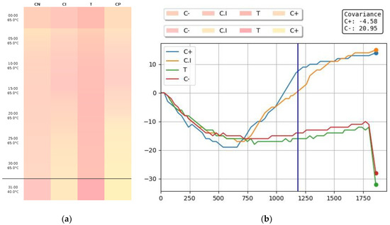 Colorimetric LAMP data. After 30 min of incubation, two images are generated: (a) is the first image which consists of the color change of the tube reactions during the 30 min, and the second image (b) is a curve with the delta of the color change. In graph (b), a different color represents each tube. The negative control tube is represented in red, the internal control tube in orange, the test tube in green, and the positive control in blue. The X-axis represents the time of the reaction in seconds. These images are sent for analysis by a healthcare professional with the anamnesis questionnaire.