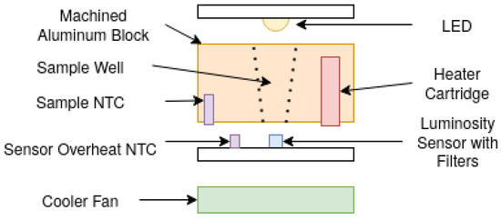 The main sensor/actuator assembly consists of a custom machined aluminum block and a 3D printed heater cartridge, located at the center and cooled by a fan at the bottom. The temperature of the block can be precisely controlled to ±0.2 °C with a range of 40–98 °C, acquiring it using a factory-calibrated negative temperature coefficient sensor (NTC), mounted at the same distance as the sample wells, to compensate for reading delays due to heat capacity in the material.
