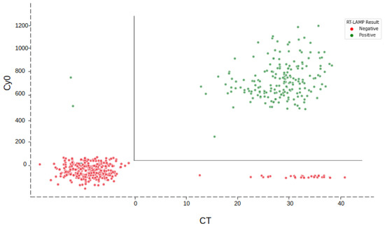 Comparison between the CT (cycle threshold) obtained from RT-qPCR for the gene N and the Cy0 (seconds) from RT-LAMP. The colors represent the qualitative result of RT-LAMP. Positive samples in RT-LAMP (Cy0 < 1200 s) are displayed as green dots and negative samples as red dots.