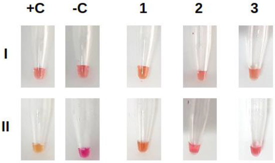 Cross-reaction experiment. SARS-CoV-2 primers were tested against Influenza A (1), Influenza B (2), and RSV (3). Images were captured before (I) and after (II) the reaction. Positive (+C) and negative (−C) controls are shown.