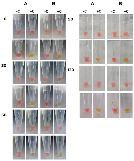Reactions were performed on the Hilab Molecular device (Hilab) or the Open qPCR (Chai Biotechnologies) single-channel thermocycler, by incubating at 65 °C for 30 min. In colorimetric reactions, to improve color reading by the equipment, the temperature was lowered to 40 °C for 1 min [1].
