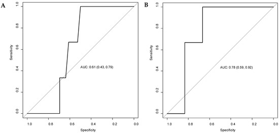ROC (receiver operating characteristic) curves for neopterin levels (A) and chitotriosidase activity (B), at presentation, considering patients’ death in the first 30 days after the intervention. AUC = area under the curve, with 95% confidence intervals.