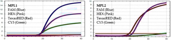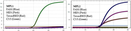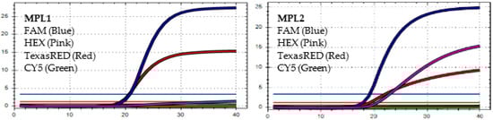 In MPL1, the target failures are detected in 2 channels, HEX and CY5. In MPL2, no target failure is detected in 3 channels, FAM, HEX, and TexasRED. No amplification is detected in channel CY5 because of the competition of high viral load with the IC (human RNAse P). This pattern is identified as variant BA.5.
