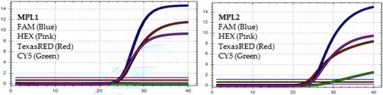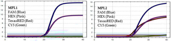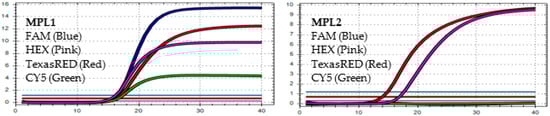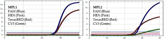 The MPL RT-rPCR mixes of MPL1 and MPL2 were prepared by using one-step RT rPCR mix (AgPath-ID™ One-Step RT-PCR, Thermo, Waltham, MA, USA). Each mix contained 10 µL of Apath-ID RT-PCR buffer 2X, 0.8 µL of Apath-ID RT-PCR enzyme 25X, 10 pm of primers (2 pm for the RNAseP-specific primers), 5 pm of probes, 1 µL of enzyme stabilizer [5,6] (a substrance used to stabilize the enzyme in the prepared RT-rPCR mixes, which was supplied by Nam Khoa Co., Ltd., Ho Chi Minh City, Vietnam), and DNAse/RNAse-free DW at 15 µL. The MPL RT-rPCR mixes were pre-filled into low-profile, white PCR tubes suitable for the real-time PCR instrument used in this study (Biorad’s CFX-96) and kept at −20 °C or lower until used.