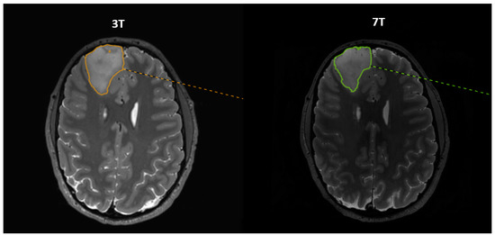World Health Organization (WHO) grade II gliomas, also known as diffuse low-grade gliomas (DLGGs), are brain tumors that originate from astrocytes or oligodendrocytes [1,2]. The classification of the tumors is based on histopathological analysis, and, since 2016, genetic and molecular parameters [3]. In 2021 the WHO updated this classification [4]. The parameters used to distinguish between grade II and III are cellular proliferation and early vascular changes [5,6]. WHO grade II DLGGs can be divided into two subgroups: (1) oligodendrogliomas, which are defined by a 1p/19q codeletion (loss of short arm of chromosome 1 and loss of long arm of chromosome 19 and isocitrate dehydrogenase (IDH)-mutation), and (2) astrocytomas, which are defined by the IDH-mutation. Furthermore, WHO grade II tumors are considered benign, which is misleading considering their infiltrative properties. DLGG is a progressive, invasive, chronic disease of the central nervous system with limited possibilities for treatment that eventually leads to a shorter life expectancy [7]. The subtypes of DLGGs differ substantially in overall survival. When surgically treated, the median overall survival of DLGGs is approximately 15 years. For oligodendrogliomas, it is statistically higher than for astrocytomas [5,7,8]. DLGGs usually transform to a higher level of malignancy, which enhances disease development and eventually leads to premature death. There seems to be a survival benefit of early resection rather than a watchful waiting [8]. The diffuse infiltration seen in DLGGs does not destroy the surrounding tissue. Contrarily, the surrounding tissue is functional to a large extent with the presence of only sporadic tumor cells. DLGG cells have been found up to 20 mm from magnetic resonance imaging (MRI) abnormalities [9]. Thus, although MRI is valuable when assessing soft tissue abnormalities, delineation of the tumor periphery and peritumoral areas is a challenging task. MRI at current clinically used field strengths might pose a limitation with regard to revealing signal changes due to diffuse microscopic pathology. Structural 7T MRI was able to detect pituitary microadenomas in 93.75% whereas for 3T it was 75% in relation to intraoperative findings in a cohort of 16 patients [10]. A study conducted with 10 neuroradiologists found that the 7T structural scans compared to the 3T structural scans were more conspicuous in a variety of neurological diseases including neoplasm [11].