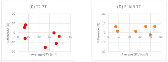 The difference in GTVs between the two observers in percentage as a function of the average GTV at each field strength and MRI sequence is shown in Figure 2. The scatterplots from Figure 2A–C show an even distribution of the dots between negative and positive percentage deviations. Figure 2D shows that six out of seven dots have a positive y-value.
