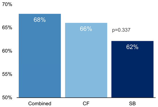 Diagnostic rate of transperineal ultrasound guided prostate biopsy types reveals that the combined method has the highest overall prostate cancer diagnostic rate, followed by CF and SB. No statistically significant difference was found between CF and SB (p = 0.337, chi-square test). CF = cognitive fusion biopsy, SB = systematic biopsy.