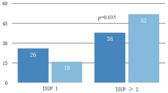 Similarly, for the ISUP 1 group, CF identified 10 patients less than SB alone. The four-subject difference between the two is due to CF diagnosing four additional ISUP ≥ 2 patients. Regarding the other ISUP score groups, we noted an upgrade by CF for all ISUP categories: five patients with ISUP 2, one with ISUP 3, two with ISUP 4 and six with ISUP 5, but none were statistically significant (Table 1).