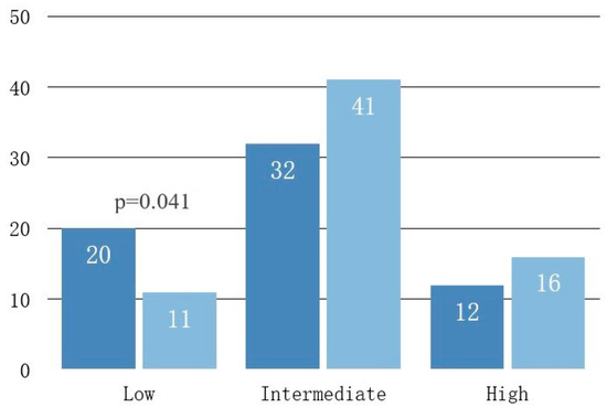 Regarding D’Amico prostate cancer risk groups, we identified 11 patients in the low-risk group (15.7%), 43 in the intermediate group (61.4%) and 16 in the high-risk group (22.9%). Cognitive fusion biopsy provided a significant risk upgrade with nine patients being moved from the low to the intermediate risk category (11 vs. 20 subjects, 13%, p = 0.041) and four other patients being diagnosed with high instead of intermediate risk cancer (12 vs. 16, 6%) (Table 2).
