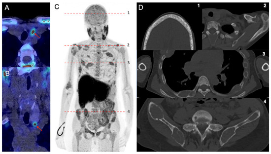 A 27-year-old woman with a history of kidney transplantation and hemodialysis was referred for sHPT. 18F-FCholine PET/CT revealed a left inferior hyperfunctioning parathyroid gland (arrows, (A): axial PET/CT, (B): coronal PET/CT) and multiples bones uptakes ((C): MIP PET anterior image) corresponding to both cystic lesions and patches of osteolysis (D) of the distal clavicles (D.2), a “salt and pepper” appearance of the skull (D.1), and both bone cysts and brown tumors in axial and extra-axial bones (D.3–4) allowing the diagnosis of osteitis fibrosa cystica (OFC). The patient was operated on, and pathology revealed a left inferior parathyroid hyperplasia.