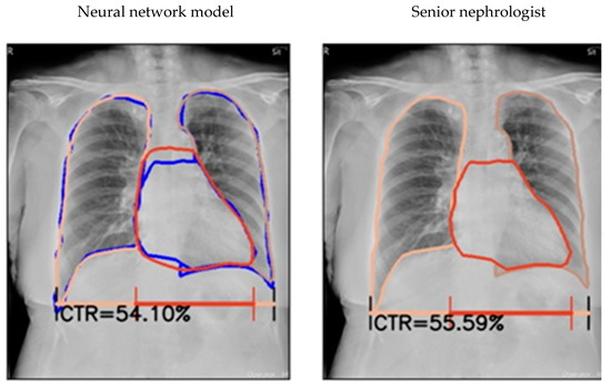 With the assistance of powerful computer hardware today, medical images can be processed by deep learning [11], and the heart and lung fields can be accurately segmented and marked. Then, the CTR can be calculated accordingly by traditional methods. Similar methods have been shown to be accurate and effective [12,13,14,15,16] in previous works. However, hemodialysis patients are predisposed to a considerable prevalence of pulmonary complications (e.g., pulmonary edema 8.20–20.50%, pleural effusions 22.95–33.80%) [17,18]. The incidence of permanent pacemaker implantation was 5.93- and 3.50-fold greater in hemodialysis and peritoneal dialysis patients than in controls (1.44 and 0.85 versus 0.24 per 1000 person-years, respectively) [19]. In an Irish study, the overall prevalence of central venous catheter use was 54% among hemodialysis patients. These factors can make automated segmentation tasks more challenging [20]. The aim of this study was to use deep-learning algorithms to establish an automated CTR calculation system for hemodialysis patients.