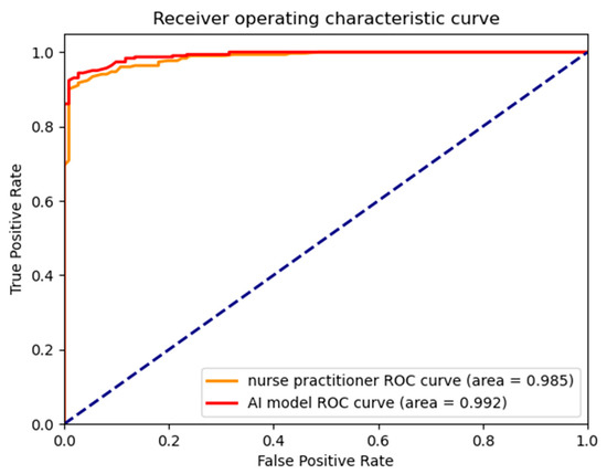 The calculation of CTR is usually performed by nurse practitioners or resident doctors in our hemodialysis unit. We also assessed the accuracy of the CTR calculated by nurse practitioners or resident doctors (Table 3). The mean absolute difference between the CTR calculated by the nurse practitioners and the ground-truth CTR was 1.52 ± 1.46%. There were 128 (31%) CXR images with an absolute CTR difference ≥ 2% relative to the nephrologist-defined mask. In contrast, the mean absolute difference between our neural network model and the nephrologist-defined mask was 0.83 ± 0.87%, and 35 (8%) CXR images had an absolute CTR value difference ≥ 2% (all p < 0.001). The average time taken in calculating the CTR value by the neural network model and the clinical staff was 1 s and 85 s, respectively. The performance in detecting cardiomegaly was comparable between the automated and manual CTR calculation methods (neural network model: accuracy 94.9%, sensitivity 96.4%, specificity 91.0%, AUC 0.992; manual calculation by nurse practitioner: accuracy 92.5%, sensitivity 90.1%, specificity 99.1%, AUC 0.985, Figure 2). Scatter plots comparing the CTRs calculated by the neural network with the CTRs by the nephrologists and the CTRs calculated by the nurse practitioners with the CTRs calculated by the nephrologists are shown in Supplemental Figure S1. Bland–Altman plots comparing the neural network with the nephrologists and the nurse practitioners with the nephrologists are shown in Supplemental Figure S2. The mean duration of the manual CTR calculation was 85 s, whereas that of the automated calculation was 2 s (p < 0.001).