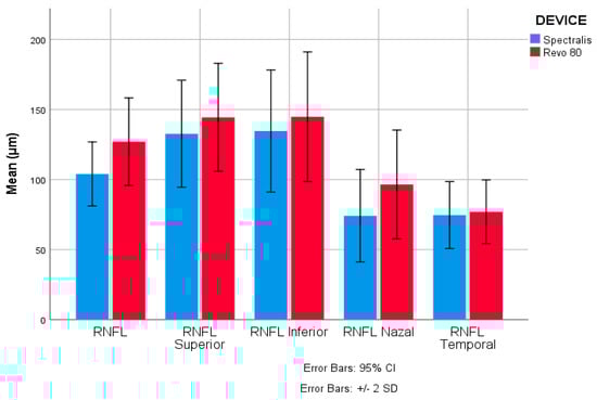 Regarding the Spectralis measurements, the mean ± SD for global RNFL thickness was 104.03 ± 22.84 μm (with a median of 103.50 μm). The inferior sector measured the highest mean, i.e., 134.64 ± 43.54 μm, and the thinnest mean was found in the nasal sector, i.e., 74.20 ± 32.96 μm. The values measured by Revo 80 were higher (p < 0.001) except for the temporal sector (p = 0.071). The mean for global RNFL thickness was 127.05 ± 31.22 μm, and the median was 127.00 μm. Concerning sectorial values, the highest mean was linked to the inferior sector, i.e., 144.86 ± 38.50 μm, although the thinnest mean RNFL appeared in the temporal sector, i.e., 77.00 ± 22.80 μm as was presented in Table 2. The mean values for both Spectralis and Revo 80 measurements are shown in Figure 2 and Figure 3.