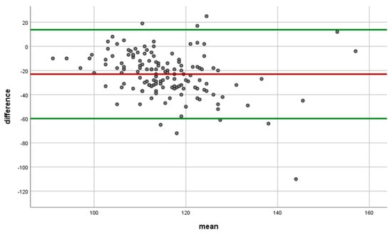 Bland–Altman chart of Spectralis and Revo80 measurements for Global RNFL, where ◦ is difference, -- mean, and -- lower and upper 95% limit values.