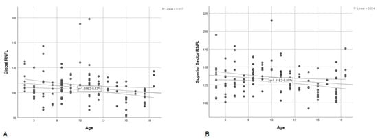 However, most studies reported no significant association between age and RNFL thickness in the pediatric population [17,22,23,24,25,26,28,30,32,33,34,35,38,39,40,41,44,49,50,51,52,53].