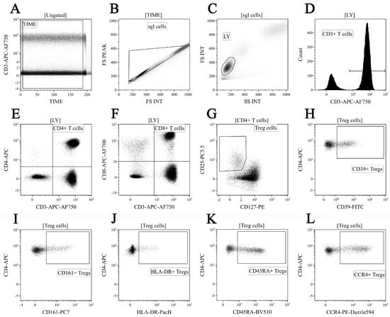 “Gating strategy” for main CD3+ T cell subsets and Treg cell surface functional antigens. Dot plot (A)—time gating; dot plot (B)—doublets exclusion; dot plot (C)—lymphocytes identification; dot plot (D)—total T cell subset gating; dot plot (E) and dot plot (F)—detection of CD4+ T cells and CD8+ T cells, respectively; dot plot (G)—Treg cells were gated as CD3 + CD4 + CD25 bright CD127 low-to-neg; dot plots (H–L)—examples of CD39, CD161, HLA-DR, CD45RA, and CCR4 to total Treg cell subsets, respectively.