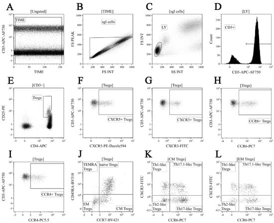 “Gating strategy” for ‘polarized’ Treg cell subset phenotyping. Dot plot (A)—time gating; dot plot (B)—doublets exclusion; dot plot (C)–lymphocytes identification; dot plot (D)—total T cell gating; dot plot (E)—regulatory T cell subsets were identified as CD3+ CD4+ CD25 bright within total CD3+ T cell subset; dot plots (F–I)—examples of CXCR5, CXCR3, CCR6, and CCR4 expression by Tregs, respectively; dot plot (J)—CD45RA and CCR7 co-expression were used to identify four main Treg maturation subsets, including CD45 RA+ CCR7+ ‘naïve’ (naïve Tregs), CD45 RA–CCR7+ central memory cells (CM Tregs), CD45 RA–CCR7 effector memory cells (EM Tregs), and CD45 RA+ CCR7 terminally-differentiated CD45 RA-positive effector memory Tregs (TEMRA Tregs); dot plots (K,L)—Th1-like Tregs were CCR6-CXCR3+, Th2-like Tregs were CCR6–CXCR3–, Th17-like Tregs were CCR6+ CXCR3–, and CCR6+ CXCR3+ “double-positive” Th17.1-like Tregs within central memory and effector memory Tregs, respectively.