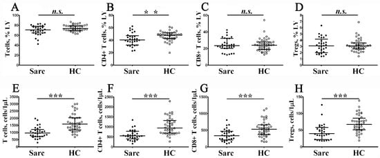 Alterations in main circulating T cell subsets from patients with sarcoidosis. Scatter plots (A–D) and (E–H) show the relative and absolute numbers of T cells, CD4+ T cells, CD8+ T cells, and Treg cells, respectively. Black circles—patients with sarcoidosis (Sarc, n = 34); white circles—the control group (HC, n = 40). Each dot represents an individual subject, and the data are shown as group medians and quartile ranges (Med (Q25; Q75)). The data were analyzed using non-parametric ANOVA with Tukey’s multiple comparison test as a post-hoc test **—p < 0.01; ***—p < 0.001).