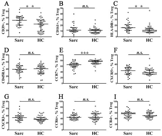 Alterations in Treg cell surface antigen expression in patients with sarcoidosis. Scatter plots (A–I) show the percentages of CD39+, CD161+, HLA–DR+, CD45 RA+, CCR7+, CXCR5+, CXCR3+, CCR6+, and CCR4+ cells within total Tregs, respectively. Black circles—patients with sarcoidosis (Sarc, n = 34); white circles—the control group (HC, n = 40). Each dot represents an individual subject, and the data are shown as group medians and quartile ranges (Med (Q25; Q75)). The data were analyzed using non-parametric ANOVA with Tukey’s multiple comparison test as a post-hoc test (**—p < 0.01; ***—p < 0.001).
