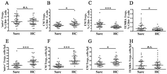 Alterations in relative and absolute frequencies of maturation Treg cell subsets in patients with sarcoidosis. Scatter plots (A–D) and (E–H) show the relative and absolute frequencies of ‘naïve’ (CD45 RA+ CCR7+), central memory (CM, CD45 RA–CCR7+), effector memory (EM, CD45 RA–CCR7–), and terminally differentiated CD45 RA-positive effector memory (TEMRA, CD45 RA+ CCR7–) Tregs, respectively. Black circles—patients with sarcoidosis (Sarc, n = 34); white circles—the control group (HC, n = 40). Each dot represents an individual subject, and the data are shown as group medians and quartile ranges (Med (Q25; Q75)). The data were analyzed using non-parametric ANOVA with Tukey’s multiple comparison test as a post-hoc test (*—p < 0.05; ***—p < 0.001).