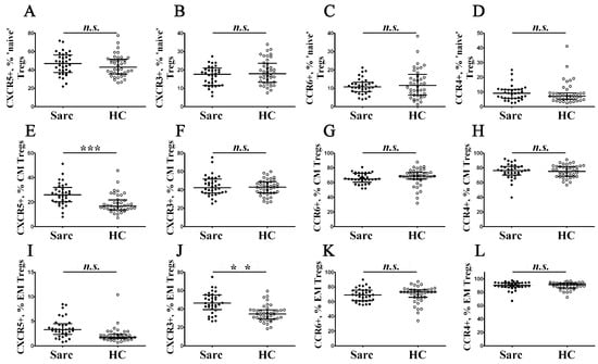We were interested in profiling chemokine receptors in TEMRA Tregs, but this subset was the smallest subpopulation of Tregs (accounting for less than 1% among Treg), and for this reason, further division to subsets, based on CXCR5, CXCR3, CCR6, and CCR4 expression, were not performed. Primarily, we found that CXCR5 expression increased in CM Treg cell subsets in patients with sarcoidosis (25.99% (20.34; 30.76) vs. 16.67% (13.73; 21.74) with p < 0.001). Next, we noticed that the relative number of CXCR3-expressing cells within EM Tregs were augmented in patients with sarcoidosis vs. the control group (46.47% (40.00; 55.01) vs. 34.53% (29.24; 38.97) with p < 0.01).