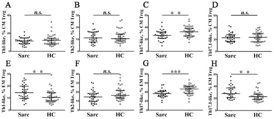 Imbalance of peripheral blood in Th1-like, Th2-like, Th17-like, and Th17.1-like cells in CM and EM Treg cell subsets in patients with sarcoidosis. Scatters plots (A–D) and (E–H) show the relative number of Th1-like (with CXCR5–CCR4+ CCR6–CXCR3+ phenotype), Th2-like (with CXCR5–CCR4+ CXCR3– phenotype), Th17-like (with CXCR5–CCR4+ CXCR3– phenotype), and Th17.1-like (with CXCR5-CCR4+ CCR6+ CXCR3+ phenotype) cells within central and effector memory Tregs, respectively. Each dot represents an individual subject, and the data are shown as group medians and quartile ranges (Med (Q25; Q75)). The data were analyzed using non-parametric ANOVA with Tukey’s multiple comparison test as a post-hoc test (**—p < 0.01; ***—p < 0.001).