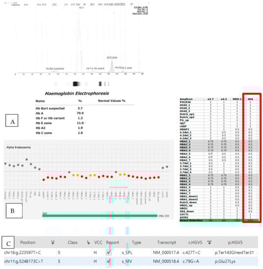 (A) Capillary electrophoresis of Case 7, which showed the presence of 1.6% HbCS at Zone 2, 11.6% HbE at Zone 4, and Hb Bart’s (3.7%) at Zone 12. (B,C) explains that αα/--SEA for alpha-thalassemia and CD 26 (HBB:c.79G>A) and CD 142 (HBA2:c.427T>C) for beta thalassemia were identified simultaneously from the DEVYSER Software. The table on the right side is the expected coverage in CNV analysis for amplicons in the HBA gene complex. (1 indicates no CNV, while 0.5 indicates deletion, and 0 indicate absence of coverage) (Red dot indicates CNV less than or equal to 0.60 or greater than or equal to 1.66, while orange dot indicates, CNV between 0.60 and 0.7 and between 1.50 and 1.66 respectively) (b These amplicons may not be affected by the several types of 3.7-deletion and triplication, leading to an absence of CNV, c “HBZ” Amplicons may demonstrate benign deletions or duplications or polymorphisms.)