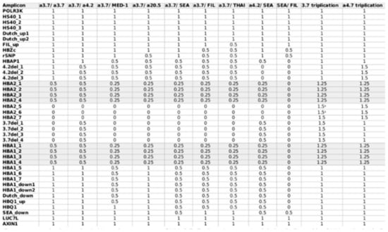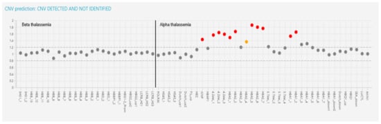 Case 12 was a case of 4.2 triplication detected by the DEVYSER Software. The table below is the expected coverage in the CNV analysis for amplicons involving HBA gene complex duplications/triplications. A 1.5 was indicative of duplication indicated by CNV analysis. (Red dot indicates CNV less than or equal to 0.60 or greater than or equal to 1.66, while orange dot indicates, CNV between 0.60 and 0.7 and between 1.50 and 1.66 respectively).