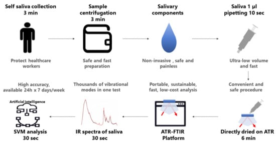 Attenuated total reflection Fourier-transform infrared (ATR-FTIR) spectroscopy is a highly sensitive and reproducible technique capable of characterizing the molecular fingerprint of a sample without extensive sample preparation [9]. It can provide label-free, sustainable, rapid, non-destructive, and cost-effective analyses of multiple components in biological samples [10,11,12,13]. In this context, ATR-FTIR provides an alternative to identify changes in carbohydrates, proteins, lipids, DNA, and RNA promoted by diseases, which can indicate spectral infrared biomarkers that correlate with gold-standard clinical biomarkers [9,14]. Minimally or non-invasive screening or diagnostic tests facilitate compliance and, as such, saliva collection is an attractive sampling method. An infrared diagnostic system for diabetes using saliva with linear discriminant analysis (LDA) showed an accuracy of 88.2%. This protocol was used with a higher amount of sample dried with continuous airflow and the saliva was inserted in barium fluoride (BaF2) windows, which limits sequential analysis due to 30 min drying for each sample and use of a potentially toxic element [15]. In addition, the salivary monitoring of DM was successfully determined using the FTIR analyses along with the PCA method, with 95.2% accuracy in rat samples [16].