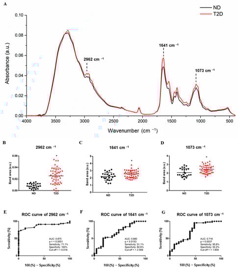 Representative average ATR-FTIR spectra (4000–400 cm−1) in saliva of non-diabetic subjects (ND) and uncontrolled type 2 diabetic patients (T2D) (A). Band area of 2962 cm−1 (B), 1641 cm−1 (C), and 1073 cm−1 (D). ROC curve analyses of 2962 cm−1 (E), 1641 cm−1 (F), and 1073 cm−1 (G). * Significantly different compared to ND.