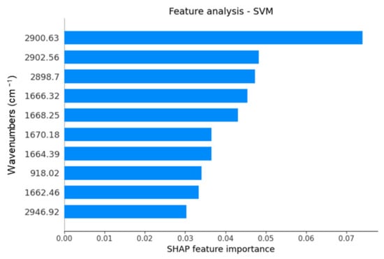 As an outcome, the SHAP feature importance indicates the main salivary vibrational modes at 2900 cm−1, 2902 cm−1, 2898 cm−1, 1666 cm−1, 1668 cm−1, 1670 cm−1, 1664 cm−1, 918 cm−1, 1662 cm−1, and 2946 cm−1 as responsible for distinguishing non-diabetic individuals and uncontrolled type 2 diabetic patients (Figure 3). The molecular assignments of each vibrational mode indicated by the SHAP feature analysis—SVM are described in Table 3 [22].