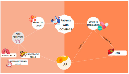 SARS-CoV-2 invades the host cells using ACE2 receptors, which are normally expressed not only in lung parenchyma, but also in pancreatic and gastrointestinal cells. A potential cause of AP is the infection of pancreatic cells, though another, less common cause is related to the medications that patients who are hospitalized with COVID-19 receive. These drugs may cause direct or indirect pancreatic damages via hypertriglyceridemia.