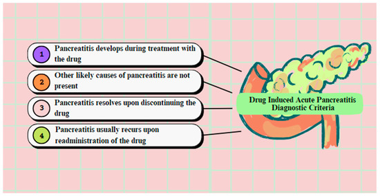 The diagnostic criteria in order to prove that a specific drug induces AP, as suggested by Mallory and Kern, were: (a) pancreatitis should have developed during the treatment with the drug; (b) other probable etiologic agents of pancreatitis, such as gallstones or alcohol abuse, should not exist; (c) there was remission of pancreatitis after the termination of the drug administration; and (d) there was recurrence of pancreatitis with the re-administration of the drug (Figure 3) [19,21,22]. It is important to mention that an increase in levels of serum amylase and/or lipase is observed in COVID-19 positive patients and develops due to the pancreatic injury caused by the virus. Interestingly, this criterion is not diagnostic for AP in those patients, due to the fact that SARS-CoV-2 virus is also responsible for other gastrointestinal pathologies, such as gastroparesis, gastritis, enteritis and colitis, which may cause this rate elevation as well [23].